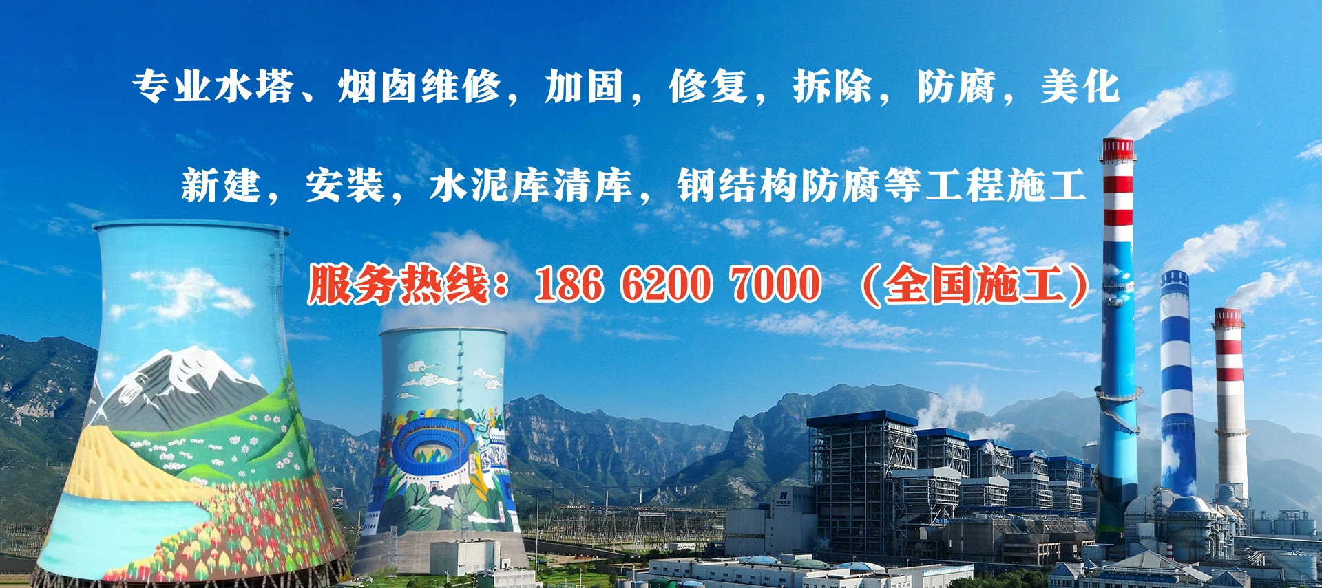 江蘇華電高空工程有限公司(全國施工)(工程熱線:186-6200-7000)我公司專業承接各類高聳構筑物(煙囪,磚煙囪,混凝土煙囪,水泥煙囪,鋼煙囪,水塔,冷卻塔,灰庫,水泥庫,筒倉,鋼結構,爐架,碼頭,電廠,化工廠等)拆除,維修,防腐,美化,改造,新建,安裝,加固,刷新,探傷,檢測,脫硫,保溫,水泥庫清庫,清灰,污水池防腐,鋼結構除銹防腐,港口防腐,化工廠防腐,電廠爐架防腐等建筑工程施工的專業公司。